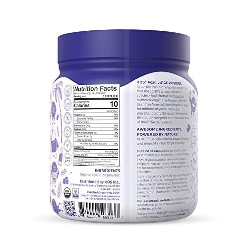 KOS Acai Powder Acai—like 20% of the world’s oxygen and half the animal and plant species—hails from a nutraceutical wonderland called The Amazon. Jammed with polyphenols, the plant kingdom’s metabolic shield against harm, acai relaxes the blood vessels, unleashes helpful antioxidant hordes, regulates sticky lipids, and coddles the kidneys. Pure Ingredients, Powered By Nature At KOS we’re dedicated to your journey, your daily energy, and the healing powers of simplicity. Suggested Use Add one serving (1 scoop) to your favorite dish or drink for a nutritious boost. Delicious Nutrition: Ditch the frozen acai for acai berry powder that has low-sugar, healthy fats, Vitamins A & C, trace minerals, fibers, flavonoids & anthocyanins, which give it its deep purple hue and proven antioxidant powers. Acai bowls, anyone? Glowing Skin: Acai powder for smoothies and your skin? Check. Electrolytes in acai berry powder help maintain the body’s water balance. Try an acai cleanse to aid with anti aging and help your skin retain its moisture, resilience & elasticity. Brain & Nerve Health: An acai supplement may protect your brain cells by supporting cognition and helping neurons flush out harmful debris. Enjoy this vibrant purple powder in an acai puree, acai bowl or even make your own acai berry capsules! Immunity Booster: Acai berries are filled with antioxidants that may aid with fighting free radicals & oxidative strain. Phytonutrients provide plants with an edge to survive adversity. Acai’s plentiful phytonutrients may do the same for the body. Premium Quality: Our organic acai powder is processed in a GMP & NSF certified facility. Each batch is also lab tested by a Verified Third Party to ensure purity, potency and quality.Premium Quality: Our organic acai powder is processed in a GMP & NSF certified facility. Each batch is also lab tested by a Verified Third Party to ensure purity, potency and quality.